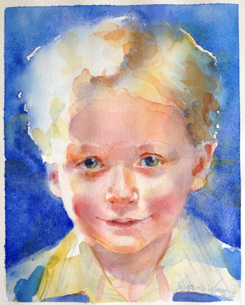 This is one of those portraits. Simon is the older kid and Laura wanted a painting based on one of her favorite photos of him as a toddler. I typically advise for the reference photos to have a strong light and shadow pattern, preferably in natural light and to avoid pictures taken with a flash or those with softer, diffused light, or back light. This just happened to be a backlit photo. If you are a beginning painter, it could make things difficult. The variation of values in the face becomes very subtle and you need a good understanding of facial structure to make it convincing. But it is doable and incidentally, two of my portraits I'm rather fond of have back light: